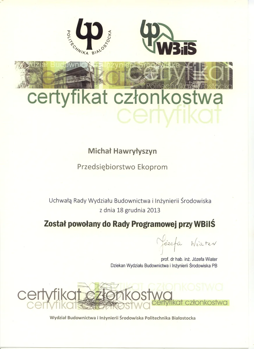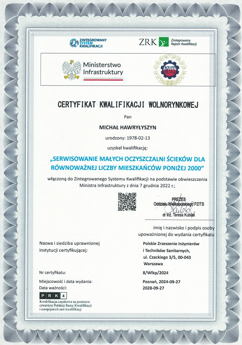 Świadczymy usługi obsługi i rozruchu przydomowych oraz małych oczyszczalni ścieków na zlecenie zarówno instytucji, jak i osób prywatnych. Posiadamy niezbędną wiedzę i umiejętności w zakresie zarówno technologii jak i rozwiązań technicznych obecnych na rynku. Jako nieliczni posiadamy kompetencje potwierdzone Certyfikatem Kwalifikacji Wolnorynkowej „SERWISOWANIE MAŁYCH OCZYSZCZALNI ŚCIEKÓW DLA RÓWNOWAŻNEJ LICZBY MIESZKAŃCOÓW PONIEŻEJ 2000” o nr 8/Wlkp/2024 Instytucja certyfikująca: Polskie Zrzeszenie Inżynierów i Techników Sanitarnych ul. Czackiego 3/500-043 Warszawa.